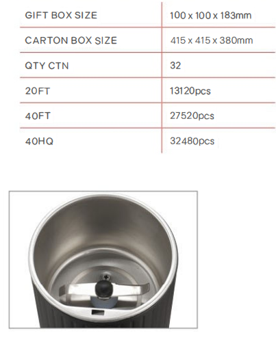 200W power Stainless Steel Cup Stainless steelblade On/off switchwith easyto operation Grindupto75grams of coffee beaneach time